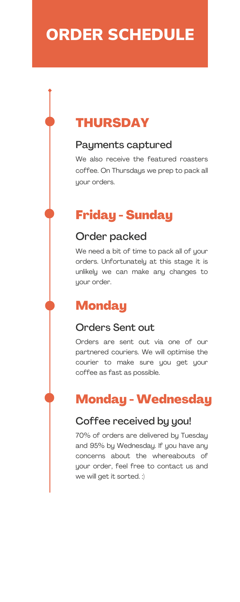 Coffees ship out on Monday mornings fortnightly. Generally 95% of our customers receive there order by Wednesday. But sometimes it takes a few days extra.